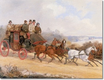 In the early 20’s, when agriculture was at its best, the farmers between Canterbury and London wanted a coach that would land them in London at noon on Monday and bring them back the same day… It was settled offhand to start a coach; Mr. Chapin said, “it must be a light coach and we will call it the Tally-ho!…It was started on that fortnight and either on its first start or soon afterwards, Mr. William Clements, whom I knew for the greater part of my life, was coachman, and at first he drove the early five o’clock Monday coach from Canterbury to London in one day, 112 miles all told; but it proved too much and afterward he drove up to London, 56 miles, and down the next day… The coach was almost always called “Clements’s coach,” and he went by the name of “gentleman coachman,” for he had quite the courtesy of Sir Roger de Coverley, combined with the most finished skill in driving his team, and he seldom went a journey without having a young lady who was travelling alone committed to his charge.