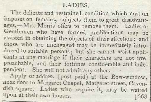 Regency Advertisements: Matchmaking (March 1807) Mar29 Comments? La Belle Assemblée, March 1807 Share this: Click to share on Facebook (Opens in new window) Facebook Click to share on X (Opens in new window) X Click to share on LinkedIn (Opens in new window) LinkedIn Click to email a link to a friend (Opens in new window) Email Click to print (Opens in new window) Print More Click to share on Tumblr (Opens in new window) Tumblr Click to share on Pinterest (Opens in new window) Pinterest Like Loading... Related
