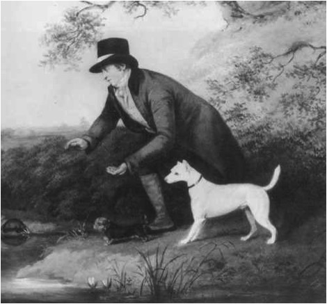 Secord’s caption reads: The now extinct White English Terrier and other early Terriers were often used to catch foxes and badgers, the latter being seen in the left middleground of this painting. Notice the small size of the little dog at the sportsman’s foot, a Terrier of unknown origin.