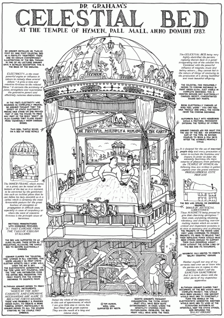 Dr. Graham, with the help of the lovely Emma, advocated mud-baths and lectured on “perpetual youth and beauty,” with the illustration of “blooming nursemaid… as the ‘Goddess of Health.'” The Celestial Bed held “great attractions for those wanting heirs, the ‘rosy Goddess of Health assisting at the celestial matters… and that sacred Vital Fire over which she watches.’ “With such attractions as these, Dr. Graham contrived to fill his rooms with a mob of silly people at five shillings a head.”