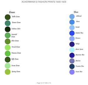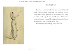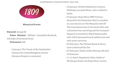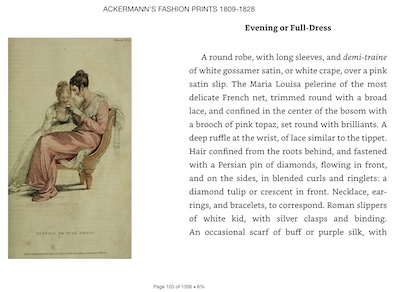 One day I discovered a website with all of the Ackermann’s Repository of the Arts volumes from 1809-1828 available to download. Wow! Thanks for doing that, Internet Archive! (I just made a donation.) The issues are all fascinating, but I was particularly interested in the fashions. To find the fashions—of which there are four per month—you have to scroll through the rest of the issue. Which is time-consuming. I mean, I just wanted to scroll through all the dresses!