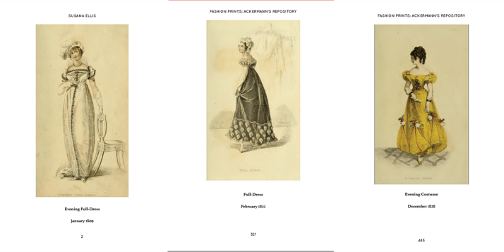 One day I discovered a website with all of the Ackermann’s Repository of the Arts volumes from 1809-1828 available to download. Wow! Thanks for doing that, Internet Archive! (I just made a donation.) The issues are all fascinating, but I was particularly interested in the fashions. To find the fashions—of which there are four per month—you have to scroll through the rest of the issue. Which is time-consuming. I mean, I just wanted to scroll through all the dresses!