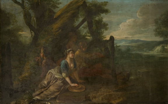 In addition to these theatrical-esque arches, four large scenes were painted and installed at the end of the walks, to camouflage the surrounding landscape and introduce a bit of fantasy. The Temple of Neptune, at the end of the South Walk, was soon replaced by the ruins of Palmyra, after the publication of Robert Wood’s journey there. A painting of an alcove of three niches with figures of Flora and the Genii, at the end of the Dark Walk, was replaced with a scene of a Chinese Garden in 1762. “At the opposite end was an altogether more eccentric scene of another alcove, but this one bore a representation of a scaffolding and ladder ready for artists to work on the canvas.” The explanation for this: