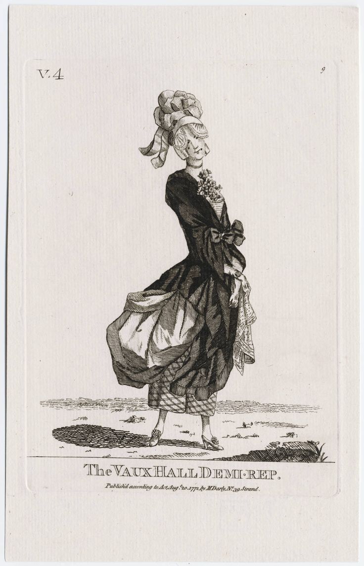 Anon., The Vauxhall Demi-Rep, engraving, 1772 (Senate House Library, London). One of the working girls who frequented the gardens. Less a prostitute than an escort, the demo-rep would join an all-male party to titillate and amuse the men.