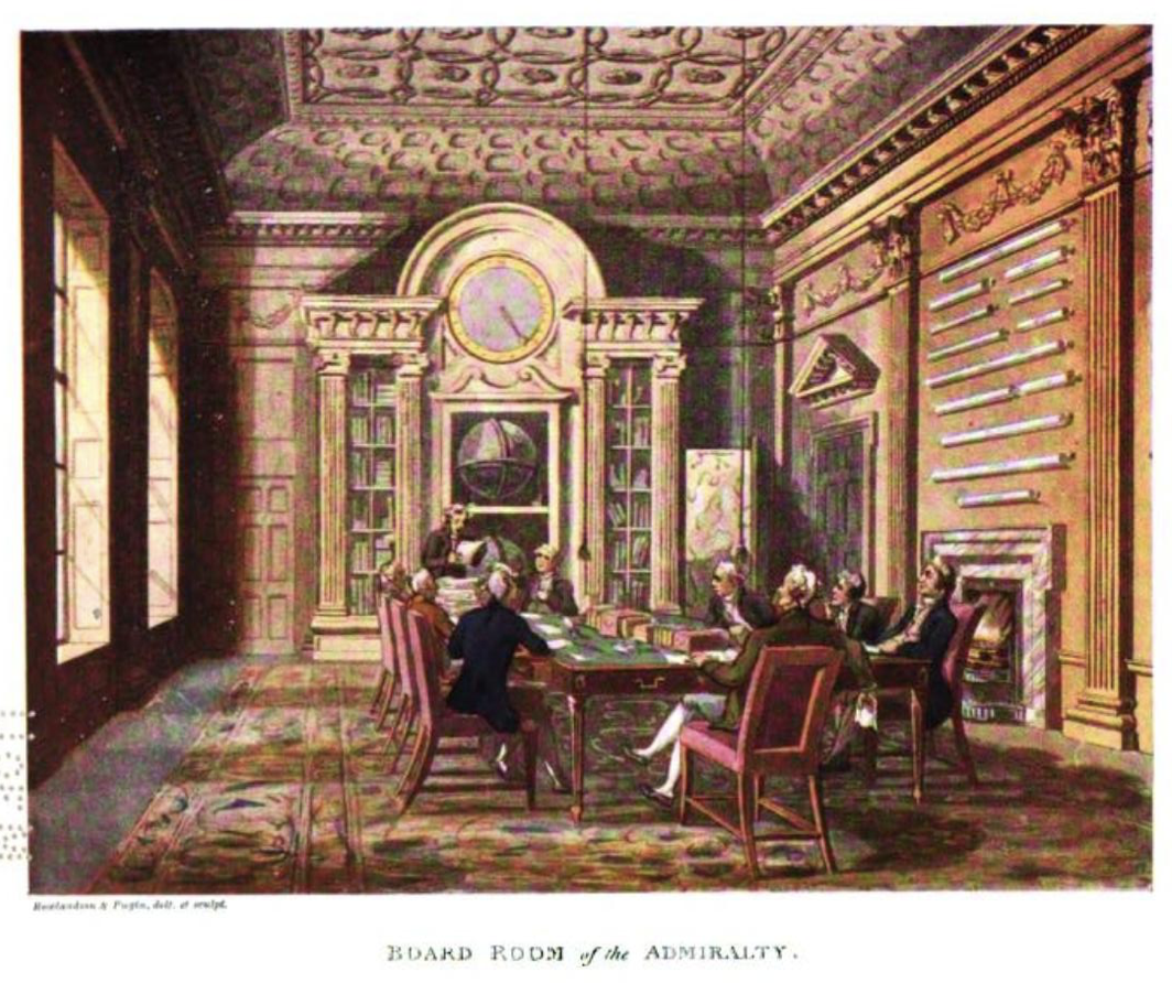 The next print is a correct interior view of THE BOARD ROOM OF THE ADMIRALTY, with its appropriate decorations of globes, books, maps, & c. The lords commissioners are represented as sitting at the table, and may be naturally supposed engaged in some business relative to the naval interest of Great Britain: and considered in that point of view, may be fairly said to be transacting a business of more real importance to this country, than any other subject that could be debated; and if taken in all its nautical relations, the acknowledged preeminence of our navy, and the various appertaining et-ceteras, it is also a matter of infinite importance to all Europe.